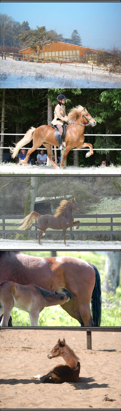 Das Gestüt Guggenberg in Freudenberg/Main, wurde 1973 von der Familie Dr. Martin Güldner 1973 gegründet und ist ein Grünlandbetrieb mit einer Fläche von 25 ha. Als Landschaftspflegebetrieb konzipiert und anerkannt beschäftigt es sich neben der eigentliche Pferdezucht intensiv mit Fragen optimaler, artgerechter Pferdepflege und Haltung. So versteht es gezielte Weidepflege, perfekte, landschaftsgerechte Einzäunungssysteme, hygienische Offenstallhaltung und gute tiermedizinische Betreuung als Garanten einer leistungsfähigen Pferdezucht. Die Betriebsgröße liegt bei 30 Islandpferden und 10 American Saddlebred Horses. Schwungvolle Tölter mit guter Haltung, Nerv und Charakter sind die Leistungsmerkmale die wir unabhängig von der Pferderasse anstreben. Die Hengste, die auf dem Gestüt eingesetzt werden – bzw. seit vielen Generationen eingesetzt worden sind – stehen für diese Points und der Erfolg unserer Zucht in den letzten Jahrzehnten ist für uns eine rechtfertigende Bestätigung. Machen Sie sich doch selbst ein Bild von uns und vereinbaren Sie einen Termin, gerne stellen wir Ihnen unsere Hengste, Stuten und Nachkommen vor. |