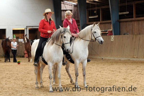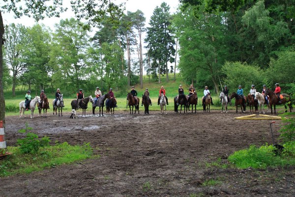 Die Ankündigung hatte uns gleich begeistert, klar wollten wir dabei sein. Als der Termin näher rückte zeigten sich die allseits bekannten Schwierigkeiten, eine stressige Woche, jeder Menge Organsisation um die Versorgung der zu Hause bleibenden Pferde zu gewährleisten und vieles mehr, garnicht so einfach, sich aufzuraffen !Auf dem Waldhof angekommen überkam uns sofort ein völlig relaxtes Urlaubsgefühl das bis zur Abfahrt am Sonntag konstant blieb. Nette Menschen überall, gute Laune, unkomplizierte Organisation. Unsere Pferde bezogen ihre Boxen und fühlten sich gleich wohl. Wie schön, mal kein Paddockmaterial durch die Gegend zu schleppen und erstmal was aufbauen zu müssen während die Pferde auf dem Anhänger warten. Das erste Zusammentreffen der Teilnehmer „ Meet and Greet" ! zeigte neue und bekannte Gesichter und viele interessante Themen. Danach trafen sich die Teilnehmer in zwei Gruppen zum Ausritt, eine Schrittgruppe und eine Gruppe, die auch schneller unterwegs sein wollte. Gute Idee, so kam jeder auf seine Kosten. Schon am Treffpunkt zum Abritt konnte man erste Eindrücke von den mitgebrachten, so verschiedenen Pferden bekommen und viele Verwandtschaften der Pferde untereinander wurden festgestellt.
