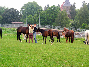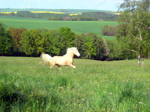 Die Fohlen wachsen artgerecht in der Herde auf und haben somit optimale Bedingungen. Bereits vom ersten Tag an sind sie an uns Menschen gewöhnt, lassen sich überall anfassen und geben die Hufe. Die Bodenarbeit findet ab dem 2. Lebenjahr statt und das Einreiten mit 3 Jahren. |