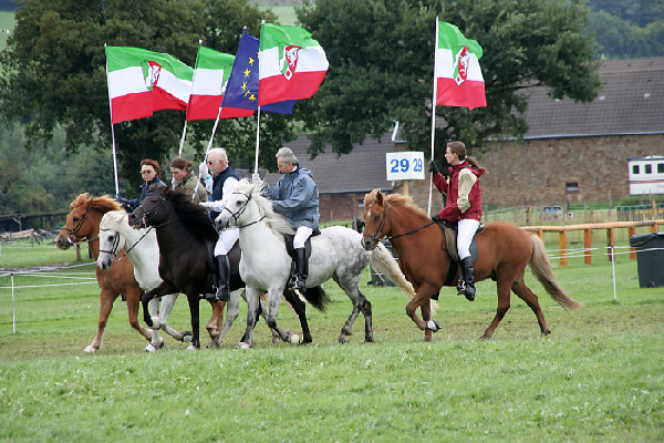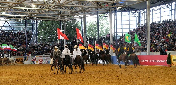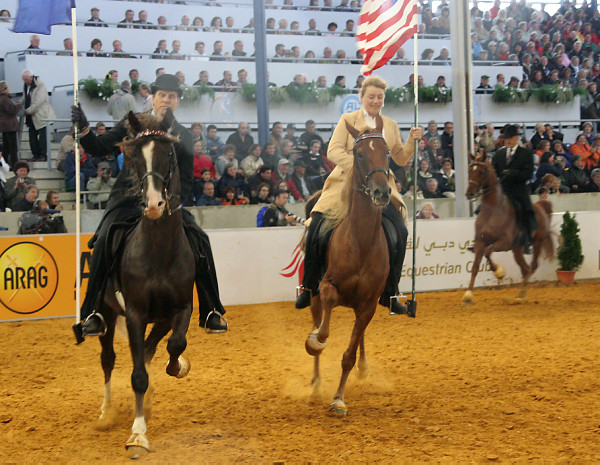 Diese Gelegenheit packte Walter Feldmann sofort beim Schopfe, trommelte sämtliche Gangpferdereiter verschiedenster Gangpferderassen zusammen und organisierte ein fantastisches Schaubild in einer der großen Show-Arenen, um der Welt einmal mehr die Vielfalt der Tölter und das was in ihnen drinsteckt zu zeigen. ![]() Vor einem Publikum von 8.000 Zuschauern tölteten und walkten Isländer, Aegidienberger, American Saddlebred Horses, Tennessee Walking Horses, Paso Peruanos und Paso Finos durch den Sand. Ein wunderbares Bild, das durch die von den Reitern getragenen Fahnen, die die Ursprungsländer der verschiedenen Rassen symbolisierten, vervollkommnet wurde.