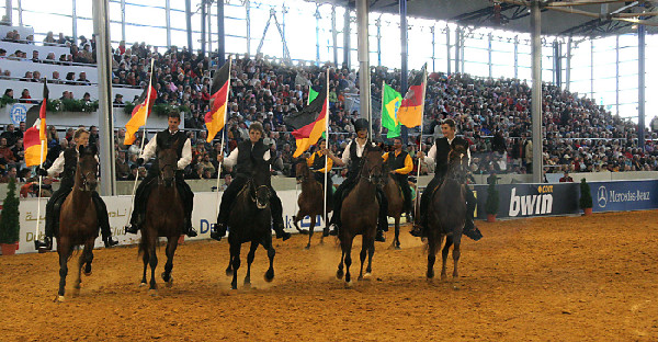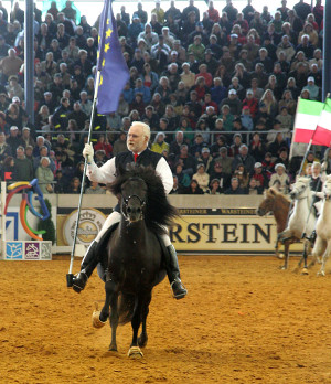 Das Schaubild wurde als eine besondere Attraktion in das Programm der Hengst-Parade mit aufgenommen und bekam von den Zuscheuern eine riesige Resonanz. Es wurde richtig laut in der Arena, als Walter Feldmann mit dem Aegidienberger Pescador und der Europa-Fahne in der Hand im astreinen 4-Takt losheizte und alle anderen Gangpferderassen in Gruppen folgten. ![]()